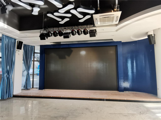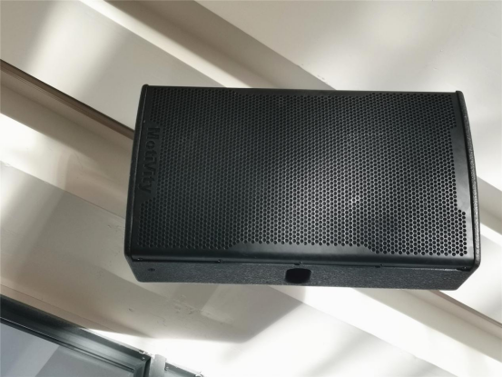学校一楼报告厅高雅而明亮,主扩音箱采用AT-12,水平吊挂安装。它那近似圆弧流线形的箱体设计,没有棱角、感官更柔和,发出的音质圆润细腻,人声与音乐兼顾得当,充分满足厅内扩声所需。
