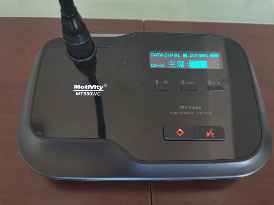 长方形会议桌上摆放着一套Motivity的无线会议系统,由系统主机MT600WZ、主席单元MT680WC、客席单元MT680WD组成。其具备讨论发言、视像跟踪等功能,无线连接的安装方式,方便、整洁又美观,加上自带的液晶显示屏,可实时提示人员进行操作。