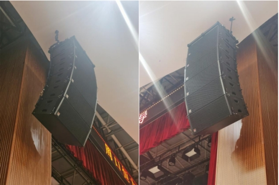根据报告厅的大小和覆盖需求,png电子平台 精心规划由线阵列作为主扩音箱。采用12只双10寸线阵全频音箱M-10,以每边6只组合吊挂在舞台两侧,形成连续、等相位的线性声源,确保全场的均匀覆盖。