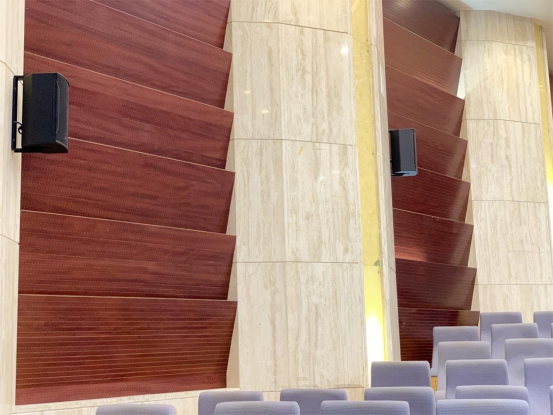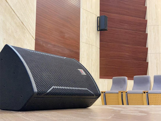 主扩音箱:两只NX-315点声源音箱,吊挂安装于舞台两侧,以其细腻、通透的音质表现,实现整个报告厅区域的清晰覆盖。