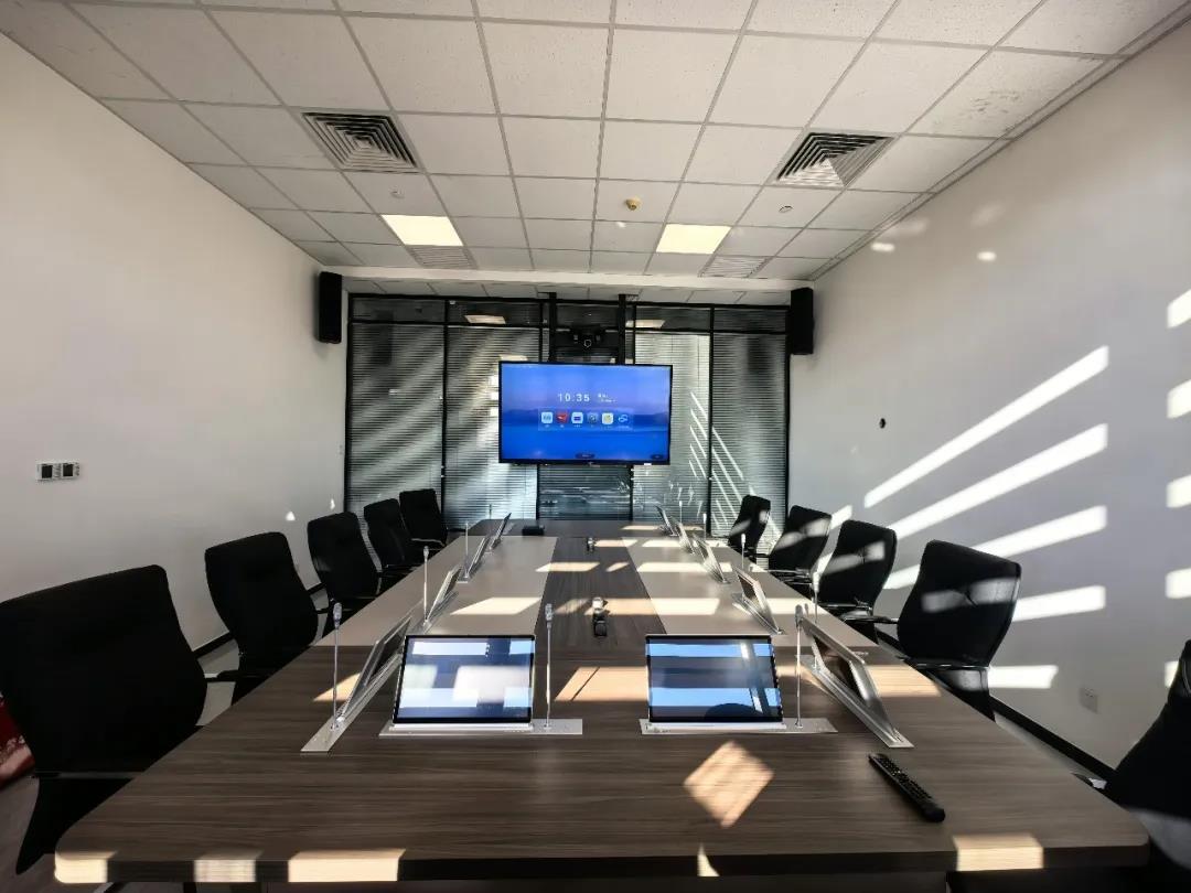 下图会议室采用17.3"升降式无纸化终端 带电子桌牌 带升降发言话筒 WZH-L4LM、音箱PAL36