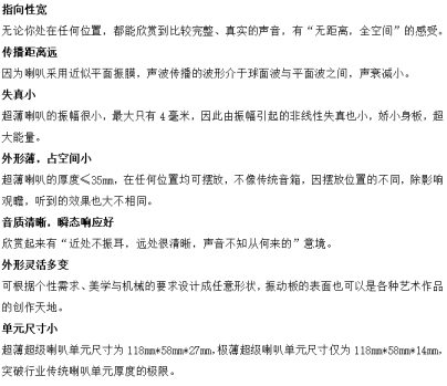 ·采用专利的超级平面喇叭单元,超薄箱体,高清晰音质、低失真、绝佳的指向特性;
