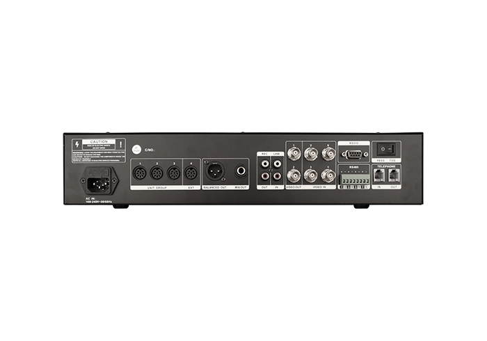 连接摄像头可实现发言实时视像追踪功能,支持4路摄像头信号输入,2路视频输出;