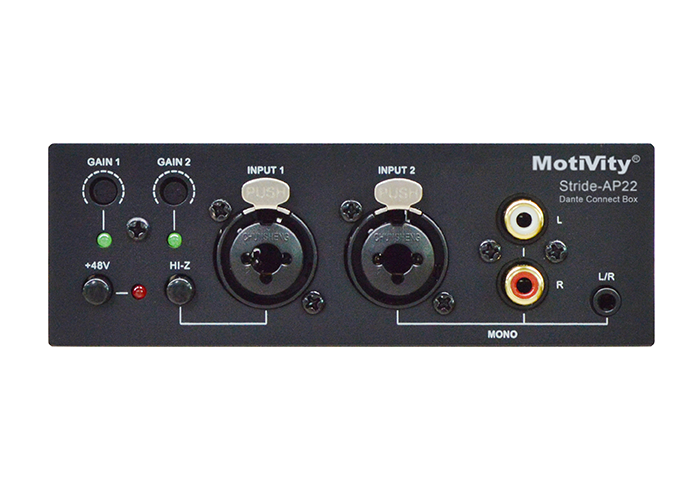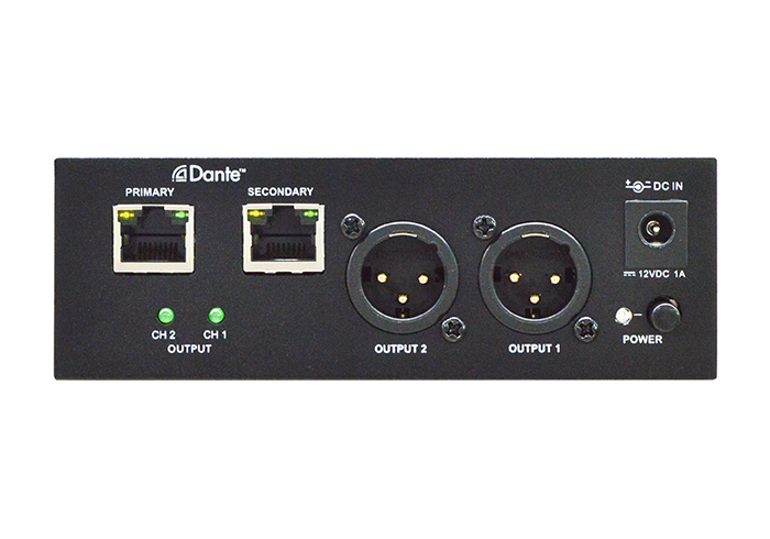 高品质A/D(24-Bit)、D/A(32-Bit)转换,48KHz采样率。2路平衡话筒/线路一体的卡侬输入,2路平衡式卡侬输出。Dante数字网络接口配置为双标准网络接口设计,全面支持级联交换及热备份功能,数字音频通道可支持2进2出,使用24-bit精度,极低的网络延时。支持AES67技术标准,可跨协议传输高品质流化音频每个输入通道具有独立的信号灯及增益控制,并具有可开关控制的+48V幻象供电。其中输入通道1具有高阻开关选择,支持吉他、贝司、键盘的乐器设备输入,输入通道2还额外具有两组立体声输入接口(一对莲花输入及一个3.5插口),支持媒体播放器、笔记本等等各种设备信号输入。每个输出通道具有独立的信号灯。Dante可在标准的现有网络交换机上使用,具有高度互操作性:与任何其他启用Dante的设备无缝协作。外接+