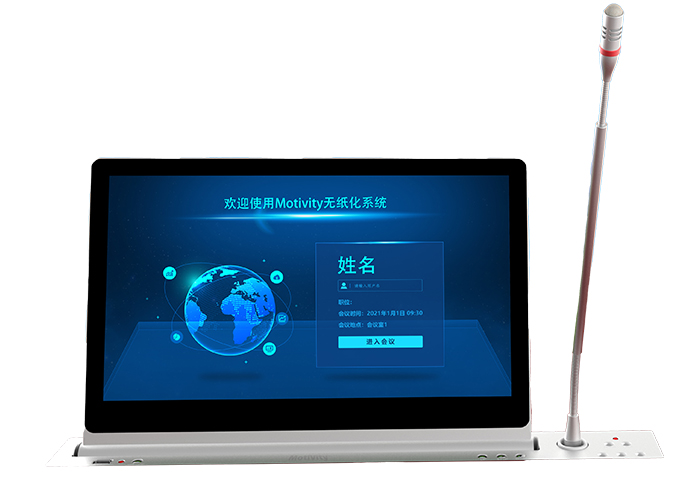 具有铭牌显示功能、会议标语功能、会议信息功能、会议议程功能、会议议题功能:按会议进程及权限显示后台推送的会议议题,议题内文件支持word\ppt\excel等办公文件、会议签到、投票表决、交互式电子白板、信息交流功能、会议呼叫服务、接收后台软件推送的通知信息等会议功能;
