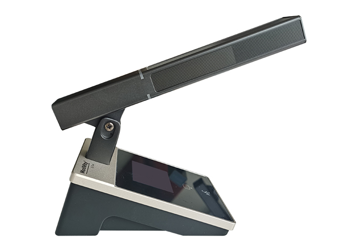 高科技金属面板设计,内置天线,整体新颖时尚庄重,带有红色灯环显示话筒工作状态。