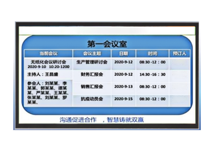 1.采用安卓一体机设计,面板采用全铝合金CNC一体成型;2.外部接口HDMI接口USB接口RJ45接口DC接口ON/OFF接口;3.服务终端可通过有线或无线和无纸化会议系统数据交换,服务终端可驱动1080P的显示屏;4.可以实时显示当前会议室会议预约情况和会议信息包括主持人和开会时间;5.高亮显示当前会议信息;6.显示会议临时通知信息,包括会议延时信息;7.开完的会议自动灰色显示;8.多屏壳滚动显示;9.屏幕尺寸采用15.6英寸液晶屏;屏幕视角:IPS全视角屏;显示比例:16:9。